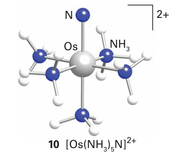 The compounds of N with H, O, and the halogens are treated separately. The saline nitrides can be regarded as containing the nitride ion, N3. However, the high charge of this ion means that it is highly polarizing (Section 1.9e) and saline nitrides are likely to have considerable covalent character. Saline nitrides occur for lithium, Li3N, and the Group 2 elements, M3N2. The covalent nitrides, in which the E-N bond is covalent, possess a wide range of properties depending on the element to which N is bonded. Some examples of covalent nitrides are boron nitride, BN, cyanogen, (CN)2, phosphorus nitride, P3N5, tetra sulfur tetranitride, S4N4, and disulfur dinitride, S2N2. These compounds are discussed in the context of the other elements. The largest category of nitrides consists of the interstitial nitrides of the d-block elements with formula MN, M2N, or M4N. The N atom occupies some or all of the octahedral sites within the cubic or hexagonal close-packed lattice of metal atoms. The compounds are hard and inert, with a metallic lustre and conductivity. They are widely used as refractory materials and find applications as crucibles, high-temperature reaction vessels, and thermocouple sheaths. The nitrideion, N3, is often found as a ligand in d-metal complexes. Its high negative charge, small size, and ability to serve as a good π-donor as well as a σ-donor, means that it can stabilize metals in high oxidation states. The short coordinate bond between the ion and the metal atom is often represented as MN. An example is the complex [Os(N)(NH3)5]2+(10).