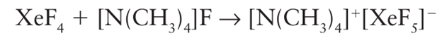 These cations are associated with the counterion by F bridges. Another similarity with the interhalogens is the reaction of XeF4 with the Lewis base F in acetonitrile (cyan methane, CH3CN) solution to produce the XeF5- ion: