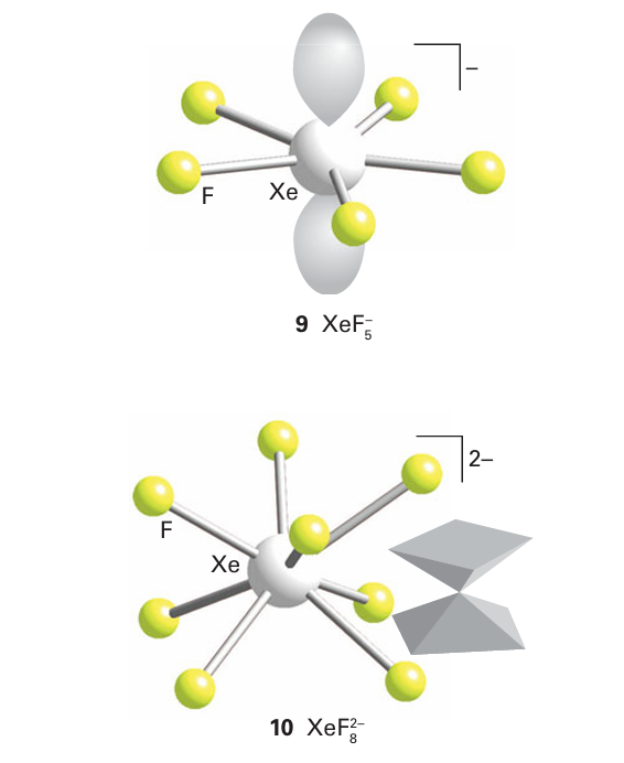 The XeF5 ion is pentagonal planar (9), and in the VSEPR model the two electron pairs on Xe occupy axial positions on opposite sides of the plane. Similarly, it has been known for many years that reaction of XeF6 with an F source produces the XeF7 or XeF8 2 ions depending on the proportion of fluoride. Only the shape of XeF8-2 is known: it is a square antiprism (10), which is difficult to reconcile with the simple VSEPR model because this shape does not provide a site for the lone pair on Xe.