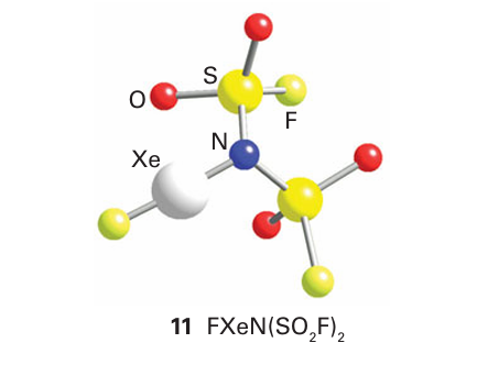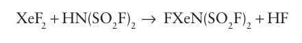 is driven forward by the stability of the product HF and the energy of formation of the Xe N bond (11). A strong Lewis acid such as AsF5 can extract F from the product of this reaction to yield the cation [XeN (SO2F)2]. Another route to XeN bonds is the reaction of one of the fluorides with a strong Lewis acid: