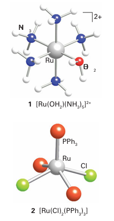 In contrast to the 3d-series, the 4d- and 5d-series metals only rarely form simple M2 (aq) ions. A few examples have been characterized, including [Ru (OH2)6]2+, [Pd (OH2)4]2+, and [Pt (OH2)4]2+. However, the 4d- and 5d-series metals do form many M(II) complexes with ligands other than H2 O; they include the very stable d6 octahedral complexes, such as (1), and the much rarer square-pyramidal d6 complexes, such as (2), which form with bulky ligands. Palladium (II) and platinum (II) form many square-planar d8 complexes, such as [PtCl4]2. The Ru (II) complex in (1) is obtained by reducing RuCl3 .3H2O with zinc in the presence of ammonia; it is a useful starting material for the synthesis of a range of ruthenium (II) pentaamine complexes that have -acceptor ligands, such as CO, as the sixth ligand:
