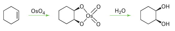 Key point: Many different oxides of the d-block elements exist, with a wide variety of structures, varying from ionic lattices to covalent molecules. Many different oxides are known for the d-block elements, with a number of different structures. We have already noted the ability of oxygen to bring out the highest oxidation state for some elements, but oxides exist for some elements in very low oxidation states: in Cu2O, copper is present as Cu(I). Monoxides are known for all of the 3d-series metals, except Cr. The monoxides have the rock-salt structure characteristic of ionic solids but their properties, indicate significant deviations from the simple ionic M2O2 model. For example, TiO has metallic conductivity and FeO is always deficient in iron. The early d-block monoxides are strong reducing agents. Thus, TiO is easily oxidized by water or oxygen, and MnO is a convenient oxygen scavenger that is used in the laboratory to remove oxygen impurity in inert gases down to the parts-per-billion range. As we have already noted, very high oxidation state oxides can show covalent structures. For example ruthenium tetroxide and osmium tetroxide are low melting, highly volatile, toxic, molecular compounds that are used as selective oxidizing agents. Indeed, osmium tetroxide is used as the standard reagent to oxidize alkenes to cis-diols: