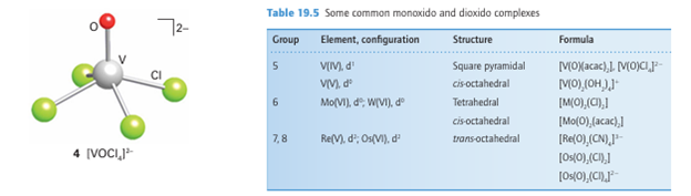 multiple bonding with the O atom appears to be responsible for the trans influence of the oxido ligand, which disfavours attachment of the ligand trans to O (Section 21.4). Vanadium in its highest (and group) oxidation state, 5, forms an extensive series of oxido compounds, many of which are the polyoxo species discussed later. The simplest oxido complex [V(O)2 (OH2)4] exists in the acidic solution formed when the sparingly soluble vanadium(V) oxide, V2O5, dissolves in water. This paleyellow complex has a cis geometry (5). Here again we see the trans influence of an oxido ligand: the cis geometry minimizes competition between the oxido ligands for -bonding to the V atom. As shown in Fig. 19.11, the two O2 ligands in the trans configuration can -bond with the same two d orbitals; in the cis configuration the metal atom has only one d orbital in common with the orbitals on the O atoms. In contrast to the cis structure of the d0 complex [V(O)2 (OH2)4] , many trans-dioxido complexes are known for the d2 metal centres Os(VI) and Re(V) (6); Table 19.5 gives some examples. This geometry is probably favoured because the trans configuration leaves a vacant low-energy orbital that can be occupied by the two d electrons. According to this explanation, the avoidance of the destabilizing effect of the d2 electrons more than offsets the disadvantage of the ligands having to compete for the same d orbital in the trans-oxido geometry.