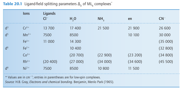 (The donor atom in an ambidentate ligand is underlined.) Thus, the series indicates that, for the same metal, the optical absorption of the cyano complex will occur at higher en ergy than that of the corresponding chlorido complex. A ligand that gives rise to a high energy transition (such as CO) is referred to as a strong-field ligand, whereas one that gives rise to a low-energy transition (such as Br-) is referred to as a weak-field ligand. Crystal field theory alone cannot explain these strengths, but ligand-field theory can, as we shall see in Section 20.2. The ligand-field strength also depends on the identity of the central metal ion, the order being approximately: