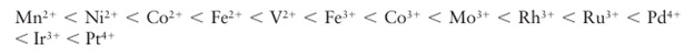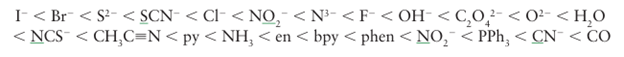 The ligand-field splitting parameter, ∆O , varies systematically with the identity of the lig and. For instance, in the series of complexes [CoX(NH3)5]n with X I, Br, Cl, H2O, and NH3, the colours range from purple (for X I ) through pink (for Cl) to yellow (with NH3 ). This sequence indicates that the energy of the lowest energy electronic transition (and therefore ∆O) increases as the ligands are varied along the series. The same order is followed regardless of the identity of the metal ion. Thus ligands can be arranged in a spectrochemical series, in which the members are arranged in order of increasing energy of transitions that occur when they are present in a complex: