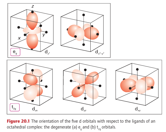 central metal ion, and the stability of the complex stems in large part from this attractive interaction between opposite charges. However, there is a much smaller but very important secondary effect arising from the fact that electrons in different d orbitals interact with the ligands to different extents. Although this differential interaction is little more than about 10 per cent of the overall metal ligand interaction energy, it has major consequences for the properties of the complex and is the principal focus of this section. Electrons in dz2 and dx2 y2 orbitals (which are of symmetry type eg in Oh; Section 6.1) are concentrated close to the ligands, along the axes, whereas electrons in dxy, dyz, and dzx orbitals (which are of symmetry type t2g ) are concentrated in regions that lie between the ligands (Fig. 20.1). As a result, the former are repelled more strongly by the negative charge on the ligands than the latter and lie at a higher energy. Group theory shows that the two eg orbitals have the same energy (although this is not readily apparent from drawings), and that the three t2g orbitals also have the same energy. This simple model leads to an energy-level diagram in which the three degenerate t2g orbitals lie below the two degenerate eg orbitals (Fig. 20.2). The separation of the two sets of orbitals is called the ligand-field splitting parameter, O (where the subscript O signifies an octahedral crystal field).