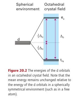 The energy level that corresponds to the hypothetical spherically symmetrical environ ment (in which the negative charge due to the ligands is evenly distributed over a sphere instead of being localized at six points) defines the barycentre of the array of levels, with the two eg orbitals lying at 3/5 ∆O above the barycentre and the three t2g orbitals lying at 2/5 ∆O below it. As in the representation of the configurations of atoms, a superscript is used to indicate the number of electrons in each set, for example t2g2.
