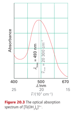 The simplest property that can be interpreted by crystal-field theory is the absorption spectrum of a one-electron complex. Figure 20.3 shows the optical absorption spectrum of the d1 hexaaquatitanium (III) ion, [Ti(OH2)6]3+. Crystal-field theory assigns the first absorption maximum at 493 nm (20300 cm-1) to the transition eg ← t2g and identifies 20300cm1 with ∆O for the complex. It is not so straightforward to obtain values of ∆O for complexes with more than one d electron because the energy of a transition then depends not only on orbital energies but also on the electron-electron repulsion energies. This aspect is treated more fully in Section 20.4 and the results from the analyses described there have been used to obtain the values of ∆O in Table 20.1.