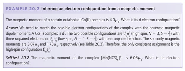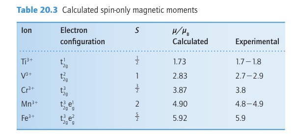 Ameasurement of the magnetic moment of a d-block complex can usually be interpreted in terms of the number of unpaired electrons it contains, and hence the measurement can be used to distinguish between high-spin and low-spin complexes. For example, magnetic measurements on a d6 complex easily distinguish between a high-spin t2g4 eg2 (N=4, S=2, μ=4.90μB) configuration and a low-spin t2g 6 (N=0, S=0, μ=0) configuration. The spin-only magnetic moments for some electron configurations are listed in Table 20.3 and compared there with experimental values for a number of 3d complexes. For most 3d complexes (and some 4d complexes), experimental values lie reasonably close to spin-only predictions, so it becomes possible to identify correctly the number of unpaired electrons and assign the ground-state configuration. For instance, [Fe (OH2)6]3+ is paramagnetic with a magnetic moment of 5.9μB. As shown in Table 20.3, this value is consistent with there be ing five unpaired electrons (N=5 and S=5/2 ), which implies a high-spin t2g3 eg2 configuration.