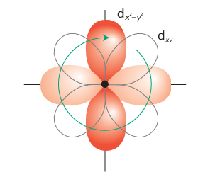 Figure 20.6 If there is a low-lying orbital of the correct symmetry, the applied field may induce the circulation of the electrons in a complex and hence generate orbital angular momentum. This diagram shows the way in which circulation may arise when the field is applied perpendicular to the xy-plane (perpendicular to this page).
