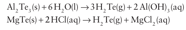 On the other hand, H2 Te is made by hydrolysis of Al2Te3 or by the action of hydrochloric acid on Mg, Zn, or Al tellurides.