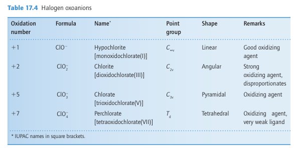 The diatomic interhalogens, XY, have been made for all combinations of the elements, but many of them do not survive for long. All the F interhalogen compounds are exergonic (ΔfGO < 0). The least labile interhalogen is ClF, but ICl and IBr can also be obtained in pure crystalline form. Their physical properties are intermediate between those of their com ponent elements. For example, the deep red -ICl (m.p. 27C, b.p. 97C) is intermediate between yellowish–green Cl2 (m.p. 101C, b.p. 35C) and dark purple I2 (m.p. 114C, b.p. 184C). Photoelectron spectra indicate that the molecular orbital energy levels in the mixed dihalogen molecules lie in the order 3Ϭ2 < 1π4 < 2π4, which is the same as in the homonuclear dihalogen molecules (Fig. 17.2). An interesting historical note is that ICl was discovered before Br2 in the early nineteenth century, and, when later the first samples of the dark red–brown Br2 (m.p. 7C, b.p. 59C) were prepared, they were mistaken for ICl. Most of the higher interhalogens are fluorides (Table 17.5). The only neutral interhalogen with the central atom in a 7-oxidation state is IF7, but the cation ClF6, a compound of Cl (VII), is known. The absence of a neutral ClF7 reflects the destabilizing effect of nonbonding electron repulsions between F atoms (indeed, coordination numbers greater than six are not observed for other p-block central atoms in Period 3). The lack of BrF7 might be rationalized in a similar way, but in addition we shall see later that bromine is reluctant to achieve its maximum oxidation state. This is another manifestation of the alternation effect (Section 9.2c). In this respect, it resembles some other Period 4 p-block elements, notably arsenic and selenium.