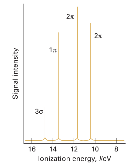 Figure 17.2 Photoelectron spectrum of ICl. The 2π levels give rise to two peaks because of spin-orbit interaction in the positive ion.