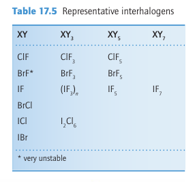 Key point: All the halogens form compounds with other members of the group. The interhalogens are formed between Group 17 elements. The binary interhalogens are molecular compounds with formulas XY, XY3, XY5, and XY7, where the heavier, less electronegative halogen X is the central atom. They also form ternary interhalogens of the type XY2Z and XYZ2, where Z is also a halogen atom. The interhalogens are of special importance as highly reactive intermediates and for providing useful insights into bonding.