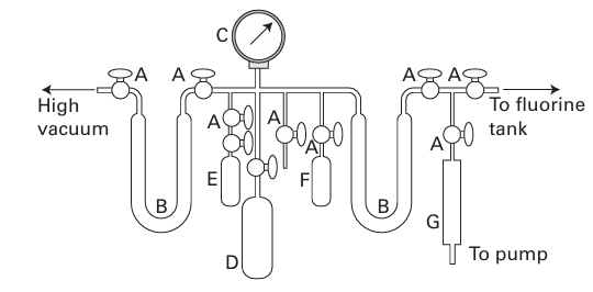 Figure 17.9 A typical metal vacuum system for handling fluorine and reactive fluorides. Nickel tubing is used throughout. (A) Monel valves, (B) nickel U-traps, (C) monel pressure gauge, (D) nickel container, (E) PTFE reaction tube, (F) nickel reaction vessel, and (G) nickel canister filled with soda lime to neutralize HF and react with F2 and fluorine compounds.