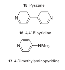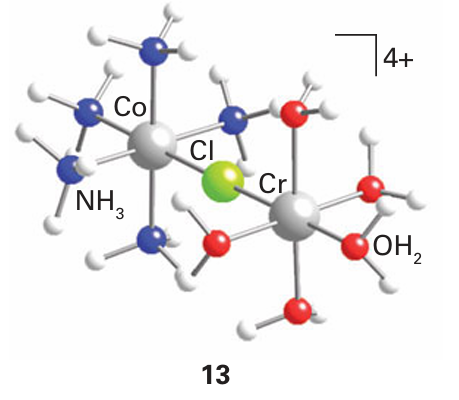 which occurs through a Cl bridge (14). The reaction depends on the transfer of a Cl-ion in the break-up of the successor complex. There is no difficulty in assigning an inner-sphere mechanism when the reaction involves ligand transfer from an initially nonlabile reactant to a nonlabile product. With more labile complexes, inner-sphere reactions should always be suspected when ligand transfer occurs as well as electron transfer, and if good bridging groups such as Cl-, Br-, I-, N3-, CN-, SCN-, pyrazine (15), 4,4-bipyridine (16), and 4-dimethylaminopyridine (17) are present. Although all these ligands have lone pairs to form the bridge, this may not be an essential requirement. For instance, just as the carbon atom of a methyl group can act as a bridge between OH and I in the hydrolysis of iodomethane, so it can act as a bridge between Cr (II) and Co (III) in the reduction of methyl cobalt species by Cr (II). The oxidation of a metal centre by oxidoanions is also an example of an inner-sphere process. For example, in the oxidation of Mo (IV) by NO3 ions, an O atom of the nitrate ion binds to the Mo atom, facilitating the electron transfer from Mo to N, and then remains bound to the Mo (VI) product: