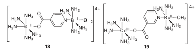 A brief illustration. Therate constant for the oxidation of the Ru (II) centre by the Co (III) centre in the bimetallic complex (18) is 1.0 102 dm3 mol 1 s 1, whereas the rate constant for complex (19) is 1.6 10 2 dm3 mol 1 s 1. In both complexes there is a pyridine carboxylic acid group bridging the two metal centres. These groups are bound to both metal atoms and could facilitate an