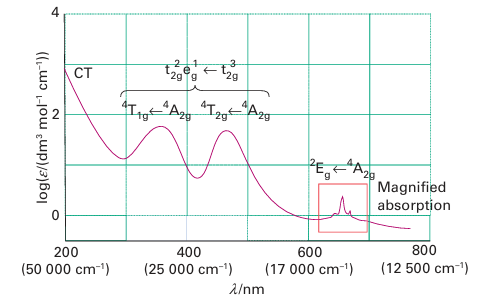 Figure 20.22 The spectrum of the d3complex [Cr (NH3)6]3+, which illustrates the features studied in this section, and the assignments of the transitions as explained in the text.