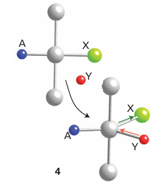 Key point: Substitution of a square-planar complex preserves the original geometry, which suggests a trigonal-pyramidal transition state. Further insight into the nature of the transition state is obtained from the observation that substitution of a square-planar complex preserves the original geometry. That is, a cis complex gives a cis product and a trans complex gives a trans product. This behaviour is explained by the formation of an approximately trigonal-bipyramidal transition state with the entering, leaving, and trans groups in the trigonal plane (4).1 Trigonal-bipyramidal in termediates of this type account for the relatively small influence that the two cis spectator ligands have on the rate of substitution, as their bonding orbitals will be largely unaffected by the course of the reaction. The steric course of the reaction is shown in Fig. 21.9. We can expect a cis ligand to exchange places with the T ligand in the trigonal plane only if the intermediate lives long enough to be stereomobile. That is, it must be a long-lived associative (A) intermediate, with release of the ligand from the five-coordinate intermediate being the rate-determining step.