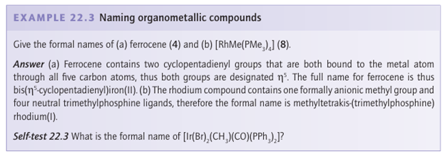 Key point: The naming of organometallic compounds is similar to the naming of coordination com pounds, but certain ligands have multiple bonding modes, which is reported as the hapticity. According to the recommended convention, we use the same system of nomenclature for organometallic compounds as set out for coordination complexes in Section 7.2. Thus, ligands are listed in alphabetical order followed by the name of the metal, all of which is written as one word. The name of the metal should be followed by its oxidation number in parentheses. The nomenclature used in research journals, however, does not always obey these rules, and it is common to find the name of the metal buried in the mid dle of the name of the compound and the oxidation number omitted. For example, (11) is sometimes referred to as benzene molybdenum-tricarbonyl, rather than the preferred name benzene(tricarbonyl)molybdenum (0). The IUPAC recommendation for the formula of an organometallic compound is to write it in the same form as for a coordination complex: the symbol for the metal is written first, followed by the ligands, listed in alphabetical order based on their chemical symbol. We shall follow these conventions unless a different order of ligands helps to clarify a particular point. Often a ligand with carbon donor atoms can exhibit multiple bonding modes—for instance, the cyclopentadienyl group can commonly bond to a d-metal atom in three different ways—thus, we need some additional nomenclature. Without going into the intimate details of the bonding of the various ligands (we do that later in this chapter), the extra information we need to describe a bonding mode is the number of points of attachment. This procedure gives rise to the notion of hapticity, the number of ligand atoms that are considered formally to be bonded to the metal atom. The hapticity is denoted ηn, where n is the number of atoms (and η is eta). For example, a CH3 group attached by a single MC bond is monohapto, η1, and if the two C atoms of an ethene ligand are both within bonding distance of the metal, the ligand is dihapto, η2. Thus, three cyclopentadienyl complexes might be described as having η1 (12), η3 (13), or η5 (14) cyclopentadienyl groups.