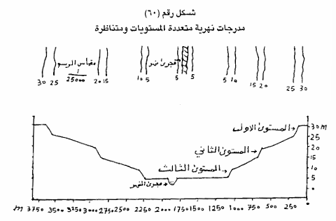 6 - ايصال الأرقام مع بعضها بخط متصل فيظهر الشكل العام للمقطع في المنطقة المحددة، كما يظهر من خلال تعرجاته موقع تلك المدرجات وإذا كانت متناظرة أو غير متناظرة.