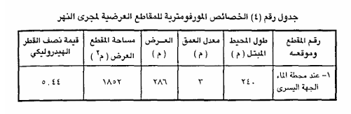 3- بيان المواضع العميقة والضحلة في مجرى النهر والتي ترتبط بها سرعة الجريان وعمليات التعرية والإرساب، ويكون ذلك من خلال معرفة المحيط المبتل والذي يمثل طول قاع المجرى مع الضفاف في المقطع العرضي، فمن خلال العلاقة بين المحيط المبتل ومساحة المقطع العرضي نحصل على نصف القطر الهيدروليكي والذي يظهر من خلال قيمته مدى احتكاك الماء بالقاع وحدوث التعرية فكلما قلت القيمة دلت على زيادة الاحتكاك وبالعكس ويتطلب ذلك إعداد جداول تتضمن معلومات عن الخصائص المورفومترية للمقاطع العرضية.