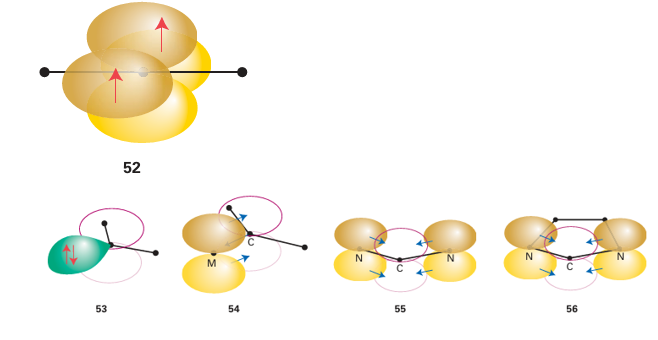 Key points: Fischer- and Schrock-type carbene complexes are considered to have a metal carbon double bond; N-heterocyclic carbenes are considered to have a metal carbon single bond, together with π backbonding. Carbene, CH2, has only six electrons around its C atom and is consequently highly reactive. Other substituted carbenes exist and are substantially less reactive and can behave as ligands towards metals. In principle, carbenes can exist in one of two electronic configurations: with a linear arrangement of the two groups bound to the carbon atom and the two remaining electrons unpaired in two p orbitals (52), or with the two groups bent, the two remaining electrons paired, and an empty p orbital (53). Carbenes with a linear arrangement of groups are re ferred to as ‘triplet carbenes’ (because the two unpaired electrons are unpaired and S=1) and are favoured when sterically very bulky groups are attached to the carbene carbon. Carbenes with the bent arrangement are known as ‘singlet carbenes’ (the two electrons are paired and S=0) and are the normal form for carbenes. The electron pair on the carbon atom of a singlet carbene is suitable to bond to a metal atom, resulting in a ligand-to-metal bond. The empty p orbital on the C atom can then accept electron density from the metal atom, thus stabilizing the electron-poor carbon atom (54). For historical reasons, carbenes bonded to metal atoms in this fashion are known as Fischer carbenes and are represented by a metal carbon double bond. Fischer carbenes are electron deficient at the C atom and consequently are easily attacked by nucleophiles. When the backbonding to the C atom is very strong, the carbene can become electron rich and is thus prone to attack by electrophiles. Carbenes of this type are known as Schrock carbenes, after their discoverer. The term alkylidene technically refers only to carbenes with alkyl substituents (CR2), but is sometimes used to mean both Fischer and Schrock carbenes.