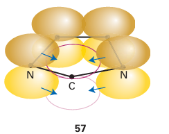 More recently, a large number of derivatives of what are known as N-heterocyclic carbenes (NHCs) have been used as ligands. In most NHCs, two nitrogen atoms are adjacent to the carbene carbon atom, and if the lone pair on the nitrogen is considered to be largely p-orbital based, then strong π-donor interactions from the two nitrogen atoms can help to stabilize the carbene (55). Tying the carbene C atom and the two N atoms into a ring helps to stabilize the carbene, and five-membered rings are common (56). Additional stability can be achieved by a double bond in the ring, which provides an additional two electrons that may be considered part of a six-electron aromatic resonance structure (57).