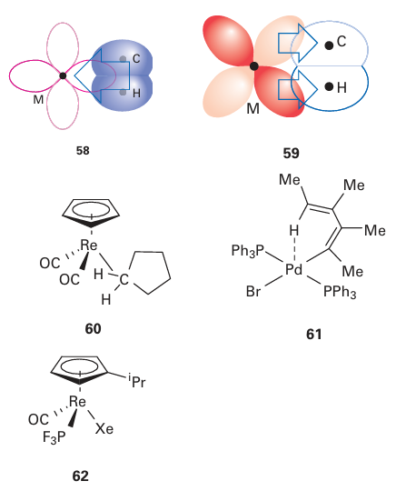 Alkanes are considered to donate electron density from a C-H σ bond to the metal atom (58), and accept π-electron density back from the metal atom into the corresponding σ* orbital (59), just like dihydrogen (Section 22.7). Although most alkane complexes are short lived, with the alkane being readily displaced, in 1998 the cyclopentane complex (60) was unambiguously identified in solution by NMR. Interactions between the C-H bond of an already coordinated ligand and the metal atom have also been observed. These species are referred to as having agnostic C-H inter actions, from the Greek for ‘to hold on to oneself’, and are thought to have additional stability due to the chelate effect (Section 7.14). Many examples of compounds with agnostic interactions are now known; an example is (61). Though weakly bonding, each C-H to metal atom interaction, whether it be agnostic or not, is considered formally to donate two electrons to the metal. Unlikely as it might seem, noble gas atoms can behave as ligands towards metal centres, and a number of complexes of Kr and Xe have been identified by IR spectroscopy, with the relatively long-lived Xe complex (62) characterized in solution by NMR in 2005. These complexes are stable only in the absence of better ligands (such as alkanes). The noble gas is formally considered to be neutral and donate two electrons.