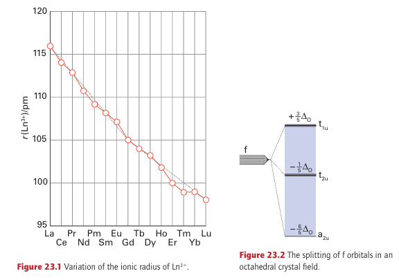 Key points: The lanthanoids are electropositive metals that commonly occur in their compounds as Ln (III); other oxidation states are stable only when an empty, half-filled, or full f subshell is produced. The elements La through to Lu are all highly electropositive, with standard potentials of the Ln3+ /Ln couple similar to that of Mg2+ /Mg (Table 23.2). They favour the oxidation state Ln (III) with a uniformity that is unprecedented in the periodic table. Other properties of the elements vary significantly. For example, the radii of the Ln3+ ions contract steadily from 116 pm for La3 to 98 pm for Lu3+. The decrease in ionic radius is attributed in part to the increase in the effective atomic number, Zeff, as electrons are added to the poorly shielding 4f subshell (Section 1.9), but detailed calculations indicate that subtle relativistic effects also make a substantial contribution. Figure 23.1 shows that the decrease in ionic radius corresponds to two gentle curves intersecting at Gd3 (f7). The effect is similar to that in the d block and can be traced to the splitting of the f-orbital energies by the crystal field generated by the ligand environment (Fig. 23.2), but the splitting is much smaller than in the d block. On the left of the series, the lower energy f orbitals (which point away from the ligands) are occupied as the number of f electrons increases (f1 to f4). For later configurations, such as f6 and f7, the higher energy