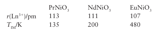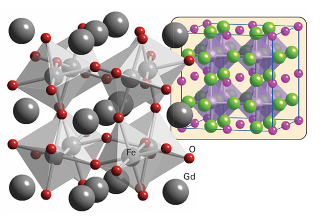 Key point: Lanthanoid ions are often found in perovskites and garnets, where the ability to change the size of the ion allows the properties of the materials to be modified. The lanthanoids are a good source of stable, large, tripositive cations with a reasonable range of ionic radii. As a result, they can take one or more of the cation positions in ternary and more complex oxides. For example, perovskites of the type ABO3 can readily be pre pared with La on the A cation site; an example is LaFeO3. Indeed, some distorted structure types are named after lanthanoids; an example is the structural type GdFeO3 (Fig. 23.6), which has vertex-linked FeO6 octahedra around the Gd3 ion (as in the parent perovskite structure, Fig. 3.9) but the octahedra are tilted relative to each other. This tilting allows better coordination to the central Gd3 ion. The ability to change the size of the B3+ ion in a series of compounds LnBO3 allows the physical properties of the complex oxide to be modified in a controlled manner. For example, in the series of compounds LnNiO3 for Ln Pr to Eu, the insulating metallic transition temperature TIM (at which the properties change from that of a metal to that of an insulator, Section 3.19) increases with decreasing lanthanoid ionic radius: