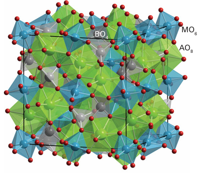 Figure 23.7 The garnet structure shown in the form of linked AO8 , BO4 , and MO6 polyhedra. The eight-coordinate A sites often occupied by yttrium can be occupied by other lanthanoids.The spinel structure (Fig. 3.44) has only small tetrahedral and octahedral holes in the close-packed O2 ion array and cannot accommodate bulky lanthanoid ions. However, the garnet structure adopted by materials of stoichiometry M3M2 (XO4)3, where M and M are normally di- and tripositive cations and X includes Si, Al, Ga, and Ge, has eight coordinate sites that can be occupied by lanthanoid ions, (Fig. 23.7). Yttrium aluminium garnet (YAG) is the host material for neodymium ions in the laser material Nd: YAG. Here we see a result of the similarities in the chemistry of yttrium from Group 3 and many lanthanoids. The contraction in the ionic radius of the lanthanoids with increasing atomic number means that many Ln3 ions have an ionic radius similar to that of Y3+ and therefore partial replacement of this ion by a lanthanide ion (for instance, Nd3+ in Nd: YAG) is easily achieved.