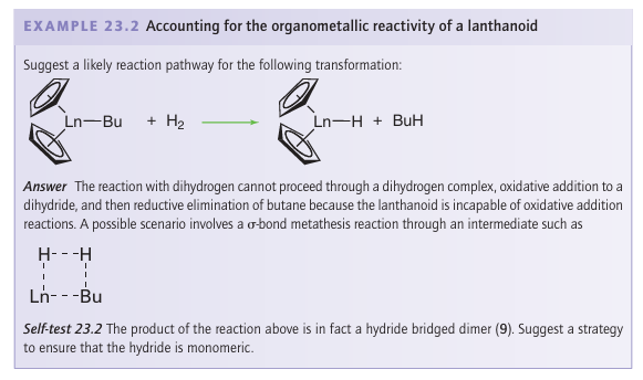 As well as an extensive organometallic chemistry of Ln (III) there are a number of Ln (II) molecular complexes that have been synthesized, including several for lanthanoids that rarely exist in this oxidation state. The species Er (II), Sm (II), and Yb (II) have extensive chemistries of this type, for example the compounds Ln (Cp*)2, but compounds of Tm (II), Dy (II), and Tm (II) have also been obtained, including TmI2 (DME)3. No lanthanoid has two stable states with oxidation numbers differing by 2, so there is no possibility of oxidative addition or reductive elimination reactions: -bond metathesis-type reactivity dominates (Section 22.23). In addition to the handling problems caused by the extreme sensitivity to air and moisture of the lanthanoid organometallic compounds, their study by NMR has been inhibited by the fact that they are all paramagnetic. Useful comparisons can be drawn through the study of compounds of the 4d-metal yttrium because Y3 has the same charge as and a size similar to a typical Ln3 ion, but is diamagnetic. In addition, yttrium is 100 per cent 89Y with I=1/2, so it is possible to measure Y-C and Y-H coupling constants quite easily and thus get additional structural information. There are strong similarities between the chemical properties of the early d-block organometallic compounds (those of Groups 3 to 5) and those of the f block. These similarities are to be expected because the early d metals are also strongly electropositive, have a limited number of d electrons to back bond with ligands, and have a limited number of accessible oxidation states. An example of a lanthanoid dinitrogen complex is (μ-N2) [(C5Me4H)2 La (THF)]2. Although the organometallic chemistry of the lanthanoids is less rich than that of the d metals, there are some striking examples of unusual reactions. For instance, a lanthanoid organometallic compound can be used for the activation of the C-H bond in methane. This discovery was based on the observation that 13CH4 exchanges 13C with the CH3 group attached to Lu: