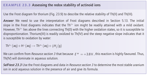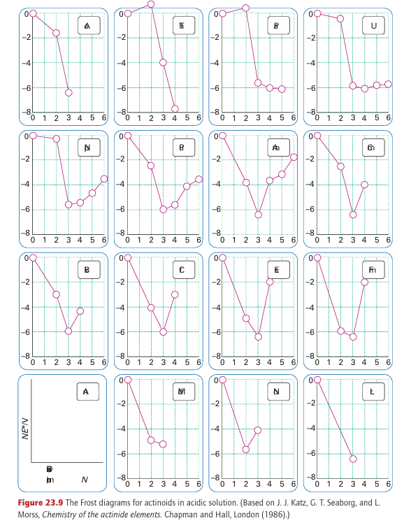 Key point: The early actinoids do not exhibit the chemical uniformity of the lanthanoids; they exist in diverse oxidation states with An (III) progressively more stable across the series. The 14 elements from thorium (Th, Z=90, 5f1) to lawrencium (Lr, Z=103, 5f14) involve the progressive completion of the 5f subshell, and in this sense are analogues of the lanthanoids. However, the actinoids do not exhibit the chemical uniformity of the lanthanoids. Whereas, like the lanthanoids, a common oxidation state of the actinoids is An (III), unlike the lanthanoids the early members of the series occur in a rich variety of other oxidation states. The Frost diagrams in Fig. 23.9 show that oxidation numbers higher than 3 are easily accessible and often preferred for the early elements of the block (Th, Pa, U, Np, Pu) whereas 3 becomes predominant in Am and beyond. Linear or nearly linear AnO2 and AnO2+2 ions are the dominant aqua species for oxidation numbers +5 and +6 exhibited by U and Np. Unlike in the lanthanoids, the f orbitals of the early actinoids extend into the bonding region, so the spectra of their complexes are strongly affected by ligands. The 5f and 6d orbitals are less compact than the 4f and 5d orbitals and the electrons in them are more available for bonding. Thus, the outermost electron configuration of U is 5f36d17s2 with all six electrons available for bonding. At around Am and Cm the 5f and 6d orbital energies are lower due to their poor screening by the other electrons, so that the later actinoids behave like the lanthanoids with only the outermost three electrons being readily ionized.