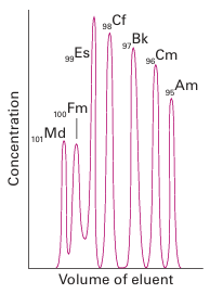 Figure 23.10 Elution of heavy actinoid ions from a cation exchange column using ammonium 2-hydroxyisobutyrate as the eluent. Note the similarity in elution sequence to Fig. 23.8: the heavy (smaller) An3 ions elute first.