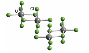 Figure 23.12 The crystal structure of U2Cl10 consists of discrete molecules formed from pairs of edge-sharing UCl6 octahedra.