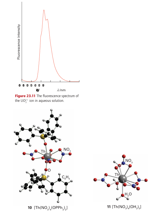Because of their ready availability and low level of radioactivity, the chemical manipulation of Th and U can be carried out with ordinary laboratory techniques. As indicated in Fig. 23.9, the most stable oxidation state of Th in aqueous solution is Th (IV). This oxidation state also dominates the solid-state chemistry of the element. Eight-coordination is common in simple Th (IV) compounds. For example, ThO2 has the fluorite structure (in which a Th atom is surrounded by a cubic array of O-2 ions) and in ThCl4 and ThF4 the coordination numbers are also 8 with dodecahedral and square antiprism symmetry, respectively. The coordination number of Th in [Th (NO3)4 (OPPh3)2] is 10 (10), with the NO-3 ions and triphenylphosphine oxide groups arranged in a capped cubic array around the Th atom. The very unusual coordination number of 11 is exhibited by Th in its hydrated nitrate Th (NO3)4 .5H2O with the Th4 ion coordinated to four NO3 ions in a bidentate fashion and with three H2O molecules (11). The chemical properties of U are more varied than those of Th because the element has access to oxidation states from U(III) to U(VI), with U(IV) and U(VI) the most common. Uranium halides are known for the full range of oxidation states U(III) to U(VI), with a trend towards decreasing coordination number with increasing oxidation number. The U atom is nine-coordinate in solid UCl3, eight-coordinate in UCl4, and six-coordinate for the U(V) and U(VI) chlorides U2Cl10 (Fig 23.12) and UCl6, both of which are molecular compounds. The high volatility of UF6 (it sublimes at 57˚C) together with the occurrence of fluorine in a single isotopic form account for the use of this compound in the separation of the uranium isotopes by gaseous diffusion or centrifugation. In gas diffusion, the lighter 235UF6 molecules travel at greater average speeds and strike the walls of a container