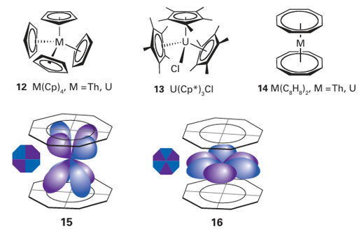 more frequently than their heavier isotopologues such as 238UF6. If the container-wall is permeable, 235UF6 will diffuse through it slightly more rapidly. A series of such ‘diffusers’, sometimes numbering thousands, enables enrichment of the gas in 235UF6. Uranium metal does not form a passivating oxide coating, so it becomes corroded on prolonged exposure to air to give a complex mixture of oxides. These oxides include UO2, U3O8, and several polymorphs of the stoichiometry UO3. The dioxide UO2 adopts the fluorite structure but also takes up interstitial O atoms to form the non-stoichiometric series UO2+x, 0<x<0.25. One form of uranium trioxide, Ϭ-UO3, adopts the ReO3 structure type (Section 24.8b). The most important oxide is UO3, which dissolves in acid to give the uranyl ion, UO2+2 [O=U=O]2+. In water, this ion forms complexes with many anions, such as NO3 and SO4+2. In contrast to the angular shape of the VO2+ ion and similar d0 complexes, the AnO2+n unit, with An=U, Np, Pu, and Am, maintains its linearity in all complexes. Both f-orbital bonding and relativistic effects have been invoked to explain this linearity. Compounds containing the UO2+2 ion show (2+n)-coordination, n=4, 5, and 6, with the four to six additional ligands forming a planar or near planar arrangement around the uranyl unit. Thus, the structure of UO2F2 has a slightly puckered ring of six F ions around the UO2+2 unit. The stability of the UO2+2 dication means that in most reactions it remains inert; recently, however, it has been shown that it is possible to reduce this species, when trapped within a rigid framework, to produce [O=U(V)-OR] +. The separation of U from most other metals is accomplished by the extraction of the neutral uranyl nitrato complex [UO2(NO3)2 (OH2)4] from the aqueous phase into a polar organic phase, such as a solution of tributyl phosphate dissolved in a hydrocarbon solvent. This kind of solvent-extraction process is used to separate actinoids from other fission products in spent nuclear fuel. The organometallic chemistry of U and Th is reasonably well developed and shows many similarities to that of the lanthanoids, except that Th and U occur in a number of oxidation states and are larger than the typical Ln ion. Thus, compounds are dominated by those containing good donor ligands, such as -bonded alkyl and cyclopentadienyl groups. The increased size of Th and U compared with typical lanthanoids means that the tetrahedral species Th (Cp)4 and U(Cp)4 (12) can be isolated as monomers, and not only can U(Cp*)3 be isolated but so too can U(Cp*)3 Cl (13). As with lanthanoid organometallic compounds, actinoid organometallic compounds do not obey the 18-electron rule (Section 22.1). Sandwich compounds are possible with the n8-cyclooctatetraene ligand, and both thorocene, Th (C8H8 )2 and uranocene, U (C8H8)2 (14) are known and are sufficiently stable not to react with water. Compared with lanthanoid complexes of cyclooctatetraene, the bonding in uranocene and thorocene is complicated by the extension of the f orbitals beyond the core of the atom. In theory, therefore, not only is bonding possible (15), but so is φ bonding (16). Quite how much of a role φ bonds play in the bonding in uranocene or thorocene is the subject of considerable debate, but it is interesting to note that actinoid cyclooctatetraene compounds are the only ‘real’ compounds (as opposed to metal dimers in the gas phase) that might contain any contribution from φ bonding.