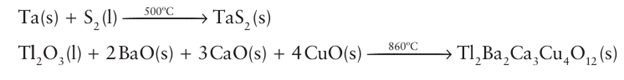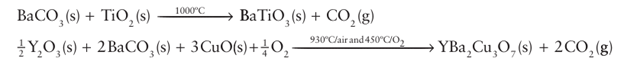 Key point: Many complex solids can be obtained by direct reaction of the components at high temperatures. The most widely used method for the synthesis of bulk inorganic solids involves heating the solid reactants together at a high temperature, typically between 500 and 1500°C, for an extended period. Normally a complex oxide may be obtained by heating a mixture of all the oxides of the various metals present; alternatively, simple compounds that decom pose to give the oxides may be used instead of the oxide itself. Thus, ternary oxides, such as BaTiO3, and quaternary oxides, such as YBa2Cu3O7, are synthesized by heating together the following mixtures for several days: