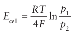 The cell potential is related to the two oxygen partial pressures (p1 and p2) by the Nernst equation (Section 5.5), for the half-cell reaction O2+4e- → 2O2- , which occurs at both electrodes.