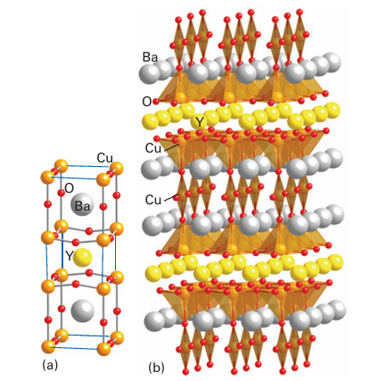 Figure 24.24 Structure of the YBa2Cu3O7 superconductor. (a) The unit cell and (b) oxygen polyhedra around the copper ions showing the layers formed from linked CuO5 square pyramids and chains formed from corner linked CuO4 square planes.