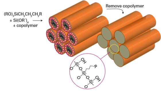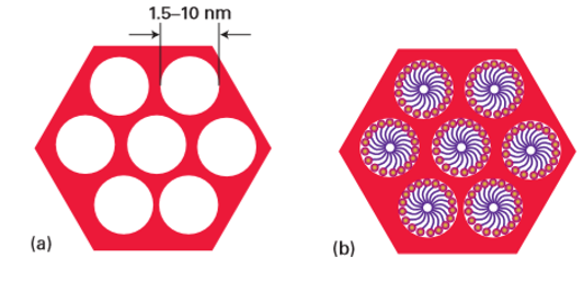 Figure 25.26 A hexagonal mesoporous structure with (a) controlled nanoporosity and (b) functionalized pores.