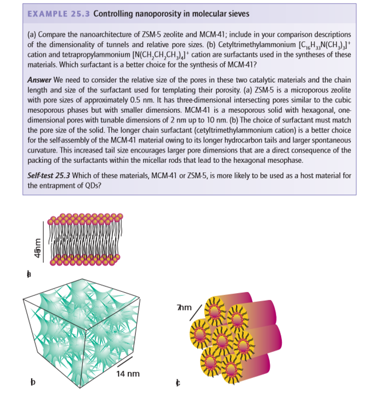 Key points: Mesoporous materials and metal–organic frameworks have ordered pore structures that are defined over the nanoscale; the synthesis of these materials relies upon control of self-assembly; guests can be incorporated into the inorganic host framework for novel applications. An important class of three-dimensionally ordered nanomaterials is mesostructured nanomaterials. Mesoporous materials are well known in heterogeneous catalysis (Chapter 26) and are of great interest because of our ability to tune their pore sizes from 1.5 to 10 nm (Fig. 25.26).
