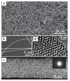 Figure 25.29 (a) SEM image of mesoporous silica nanofibres. (b) Lowmagnification TEM image of the nanofibres. (c) High magnification TEM image of one nanofibre. The inset is a selected-area electron diffraction pattern of the nanofibre. (d) High-resolution TEM image recorded at the edge of one nanofibre. (J. Wang, et al., Chem. Mater., 2004, 16, 5169.)