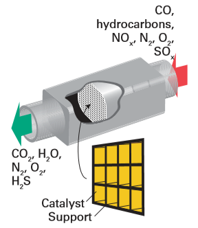 to the catalytic converter used to oxidize CO and hydrocarbons and reduce nitrogen oxides in automobile exhausts (Fig. 26.4), see also Box 26.1.