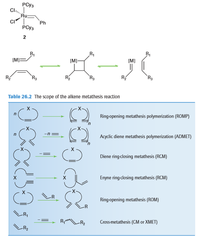 Alkene metathesis was first reported in the 1950s with poorly defined mixtures of reagents, such as WCl6/Bu4Sn and MoO3/SiO2, being used to bring about a number of different reactions (Table 26.2). In recent years, a number of newer catalysts have been introduced, and the development of the well-defined ruthenium alkylidene compound (2) by Grubbs in 1992, now known as Grubbs’ catalyst, was of seminal importance.2 Alkene metathesis reactions proceed through a metallacyclobutane intermediate: