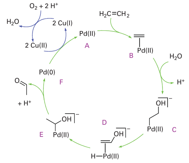 Its invention at the Wacker Consortium für Elektrochemische Industrie in the late 1950s marked the beginning of an era of production of chemicals from petroleum feedstock. Al though the Wacker process is no longer of major industrial concern, it has some interesting mechanistic features that are worth noting. The actual oxidation of ethene is known to be caused by a palladium (II) salt: