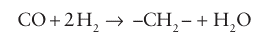 The process is exothermic, with ∆r HO=-165 kJ mol 1. The product range consists of aliphatic straight-chain hydrocarbons that include methane (CH4) and ethane, LPG (C3 to C4 ), gasoline (C5 to C12 ), diesel (C13 to C22 ), and light and heavy waxes (C23 to C32 and >C33 , respectively). Side reactions include the formation of alcohols and other oxygen ated products. The distribution of the products depends on the catalyst and the tempera ture, pressure, and residence time. Typical conditions for the Fischer–Tropsch synthesis are a temperature range of 200–350ºC and pressures of 15–40 atm. There is general agreement that the first stages of the hydrocarbon synthesis involve the adsorption of CO on the metal, followed by its cleavage to give a surface carbide (and water), and the successive hydrogenation of such species to surface methyne (CH), methylene (CH2), and methyl (CH3) species, but there is still debate on what happens next and how chain growth occurs. One proposal suggests a polymerization of bridging surface CH2 groups initiated by a surface CH3 group. However, the fact that many such species have been isolated and are stable as metal complexes suggests that the mechanism is probably not so simple. Other mechanistic investigations of these processes have suggested an alternative possibility for chain growth in the hydrocarbon synthesis, namely that it proceeds by combination of surface bridging CH2 groups and alkenyl chains (M-CH=CHR), rather than by the combination of alkyl chains (M-CH2 CH2 R) with methylene groups in the surface. Several catalysts have been used for the Fischer–Tropsch synthesis; the most import ant are based on Fe and Co. Cobalt catalysts have the advantage of a higher conversion rate and a longer life (of over 5 years). The cobalt catalysts are in general more reactive for hydrogenation and produce fewer unsaturated hydrocarbons and alcohols than iron catalysts. Iron catalysts have a higher tolerance for sulfur, are cheaper, and produce more alkene products and alcohols. The lifetime of the iron catalysts is short, however, and in commercial installations generally limited to about 8 weeks.