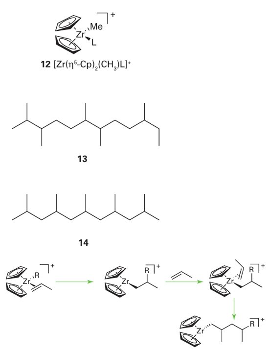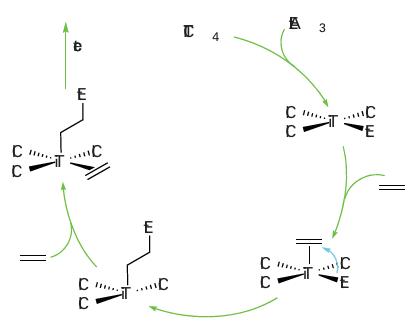 Key points: Heterogeneous Ziegler–Natta catalysts are used in alkene polymerization; the Cossee–Arlman mechanism describes their function; low molar mass homogeneous catalysts also catalyse the alkene polymerization reaction; considerable control over polymer tacticity is possible with judicious ligand design. Polyalkenes, which are among the most common and useful class of synthetic polymers, are most often prepared by use of organometallic catalysts, either in solution or supported on a solid surface. The development of alkene polymerization catalysts in the second half of the twentieth century, producing polymers such as polypropene and polystyrene, ushered in a revolution in packaging materials, fabrics, and constructional materials. In the 1950s J.P. Hogan and R.L. Banks discovered that chromium oxides supported on silica, a so-called Philips catalyst, polymerized alkenes to polyenes. Also in the 1950s K. Ziegler, working in Germany, developed a catalyst for ethene polymerization based on a catalyst formed from TiCl4 and Al (C2H5 )3, and soon thereafter G. Natta in Italy used this type of catalyst for the stereospecific polymerization of propene (see below). Both the Ziegler–Natta catalysts and the chromium-based polymerization catalysts are widely used today.