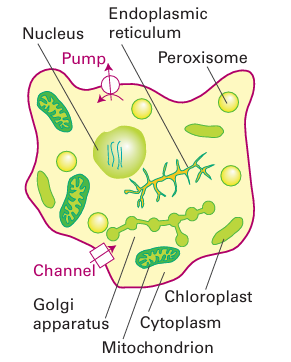 Figure 27.1 The layout of a generic eukaryotic cell showing the cell membrane, various kinds of compartments (organelles), and the membrane-bound pumps and channels that control the flow of ions between compartments.
